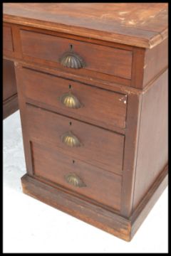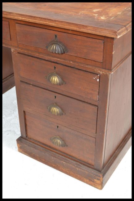 A Victorian 19th Century mahogany twin pedestal Partners desk, later tooled green leather inset to top, six frieze drawers, twin pedestals each with two stacks of three drawers with single cupboard to each opposing side. Measures 73cm high x 144cm wide x 80cm depth.