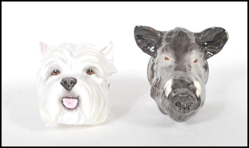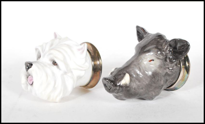 A Bloor China stirrup cup in the form of a boar together with a Royale Stafford stirrup cup in the form of a Westie, both having silver plate rims.