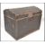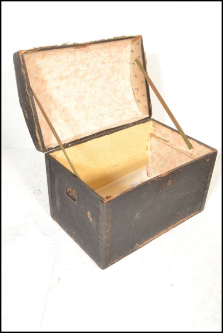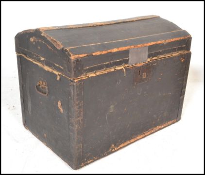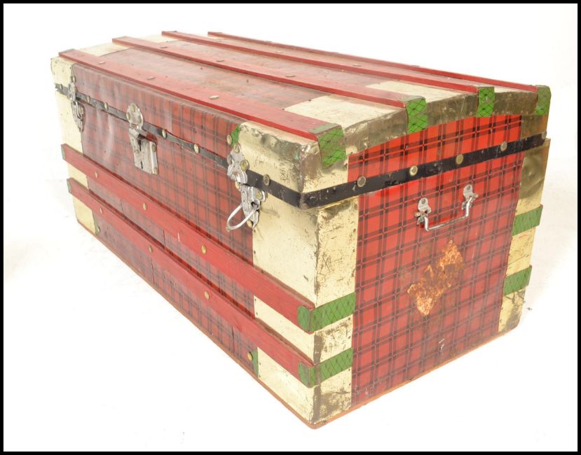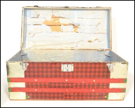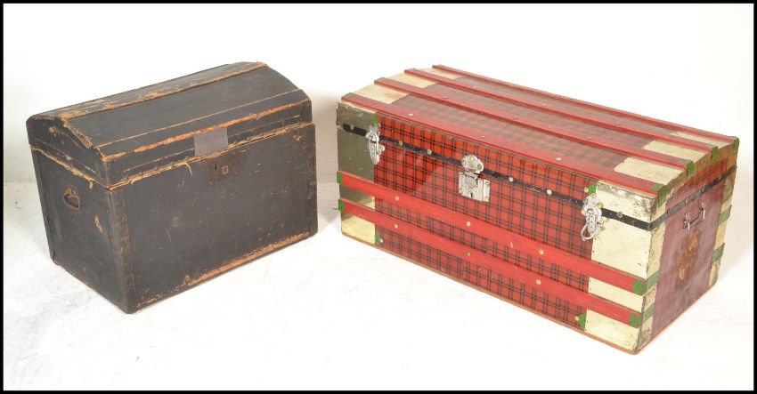 Two vintage 20th Century trunks, one being cover in tin having red and black tartan decoration with green detailing. Together with a dome top trunk finished in black. Both having carrying handles to sides. Measures 48cm high x 99cm wide x 48cm depth.