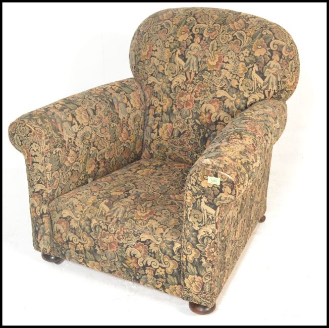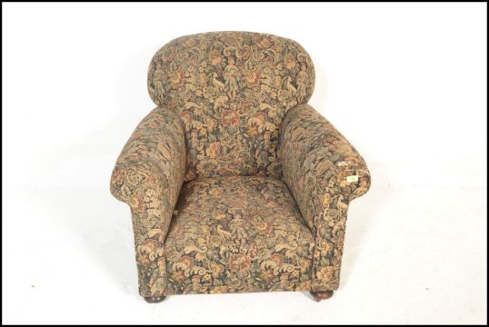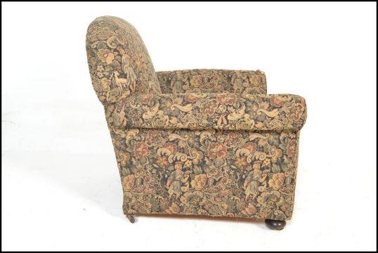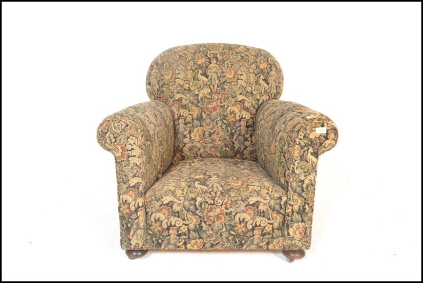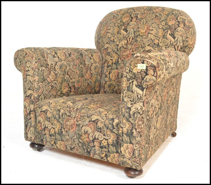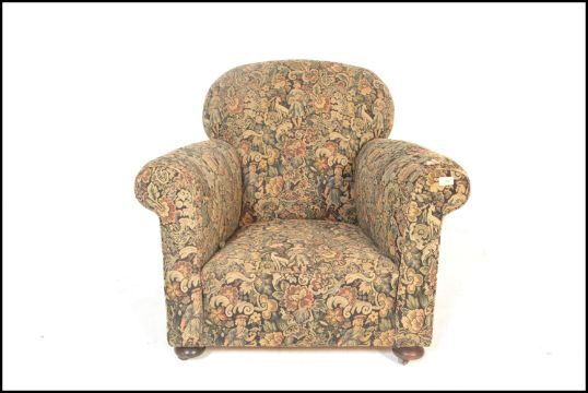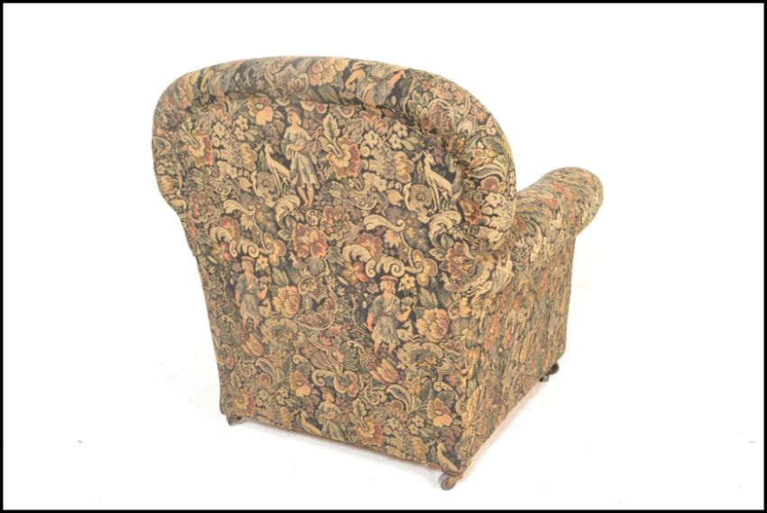 A late 19th century Victorian Chesterfield armchair having barrel  and back rest  being raised on bun feet with castors below, upholstered in a needlepoint decorative fabric