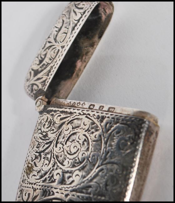 A 19th Century Victorian silver hallmarked chase engraved match vesta, Birmingham assay, dating to 1899, rubbed makers marks. Weighing 22.47