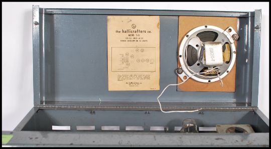 A 20th Century American vintage communications radio receiver by The Hallicrafters co Chicago, model number S-86 105-125 volts AC DC power consumption 40 watts. Finished in grey.