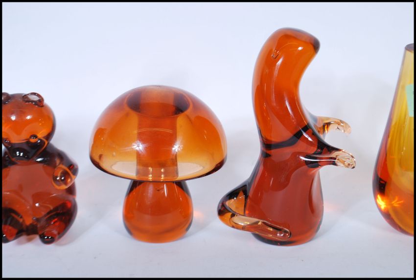 A good collection of 20th century studio art glass Whitefriars glass figurines to include a pair of bears, vases and others, finish in dark orange.