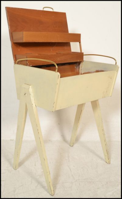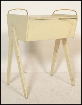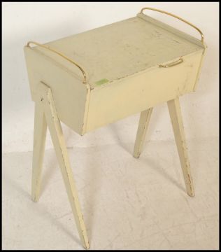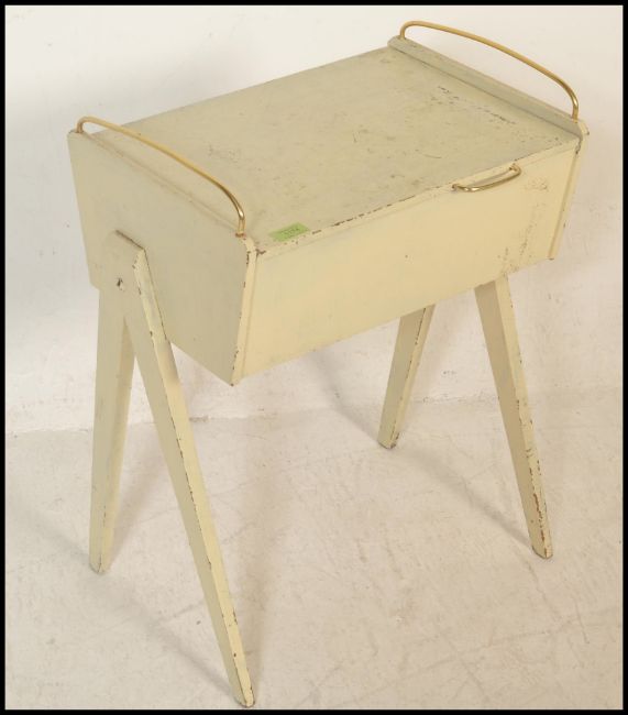 A vintage retro wooden sewing box being painted in white with angular tapering legs and brass handles to top.