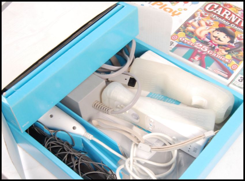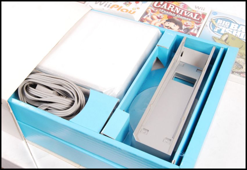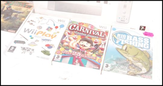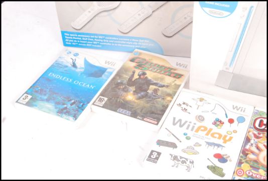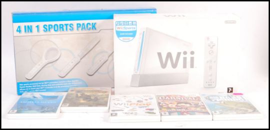 A boxed Nintendo Wii video games computer console complete with adaptor, 3-pin scart cable, remote, sensor along with an unofficial 4 in 1 sports pack and a collection of 5x games to include; Big Catch Bass Fishing, Carnival Funfair Games, Wii Play, Ghost Squad and Endless Ocean.