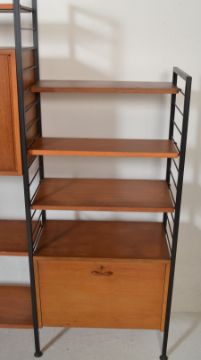 Staples - Ladderax - A 1970's retro vintage teak wood four bay modular wall shelving unit / room divider comprising of a configuration of cupboards and shelves, raised on ebonised metal uprights. 130cm x 230cm x 30cm