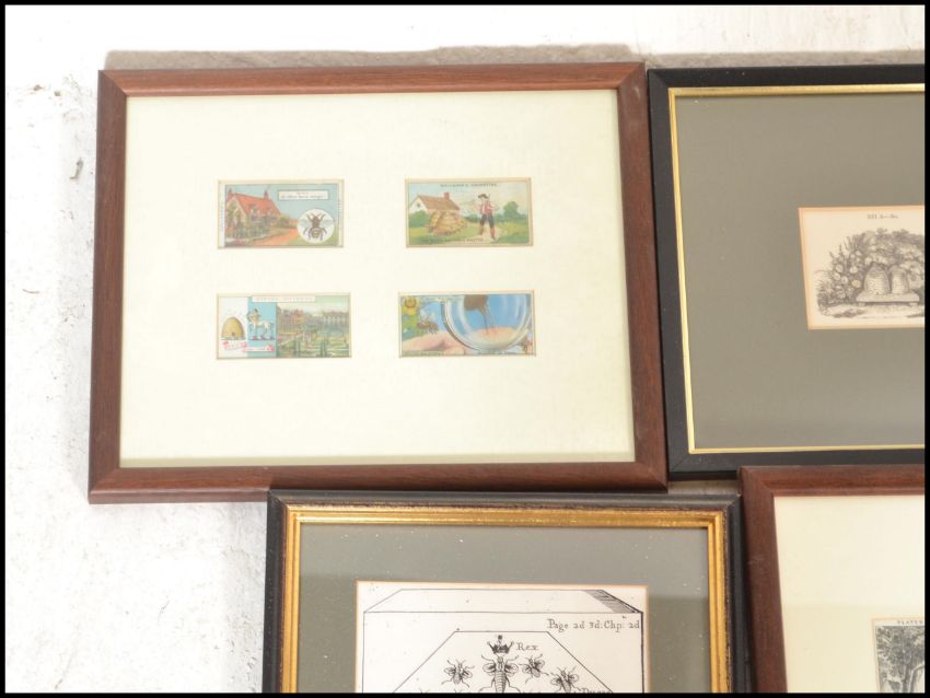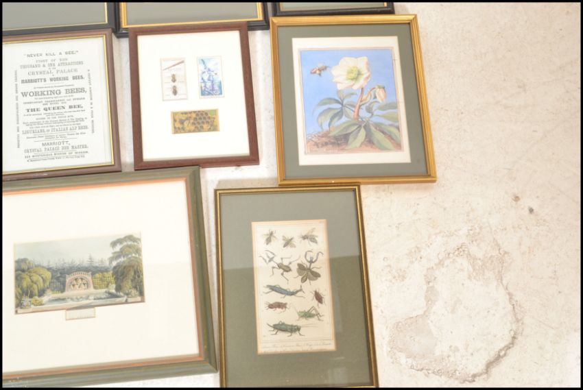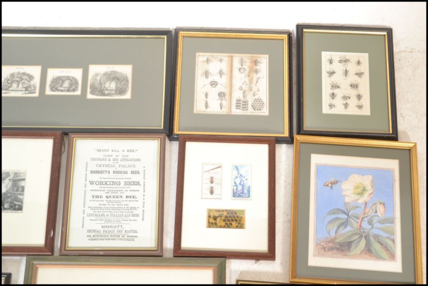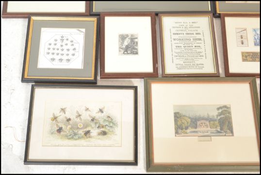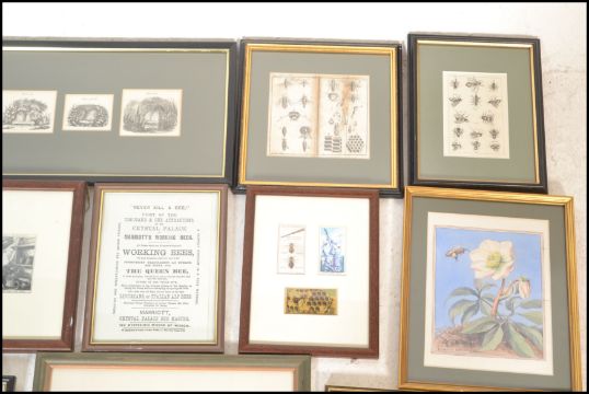 Bee Keeping Intestert. A large collection of 19th century and early 20th century etchings / prints of bee hive / keeping interest. To include framed and glazed cigarette cards, coloured etchings, an Apiary, watercolour by Dorothy Hodges, anatomical / nature interest plates etc. 23cms x 28cms