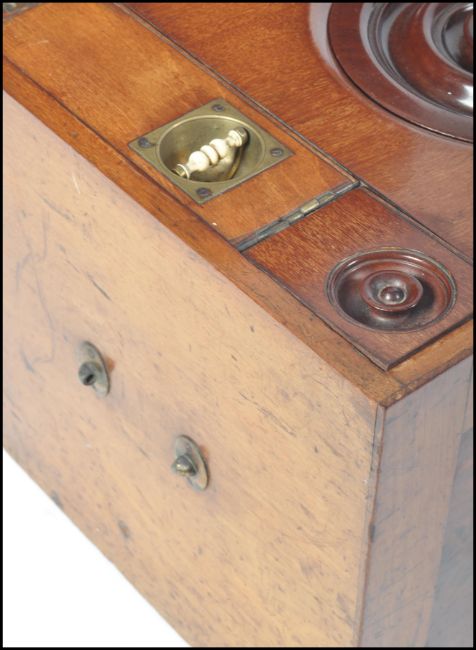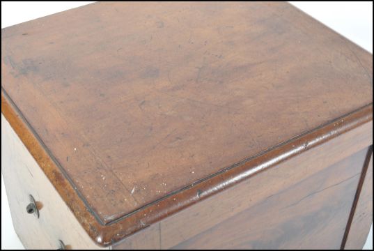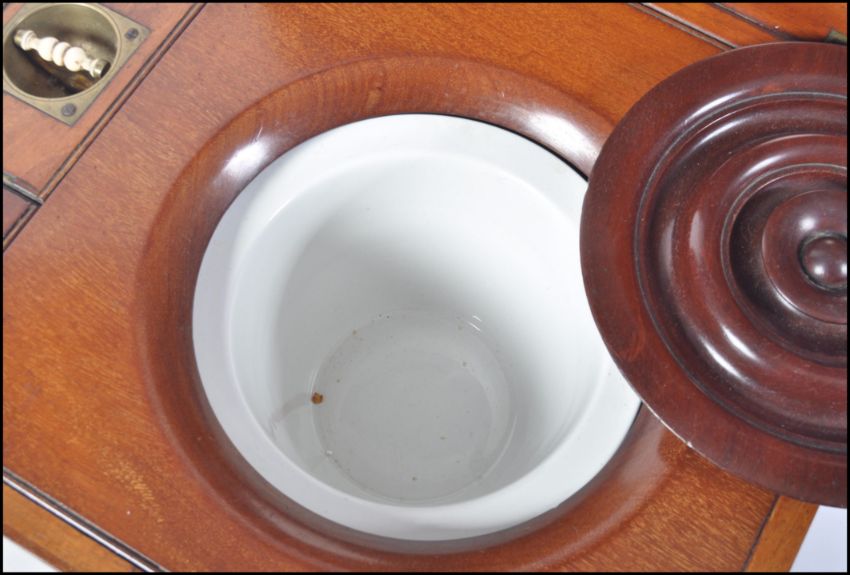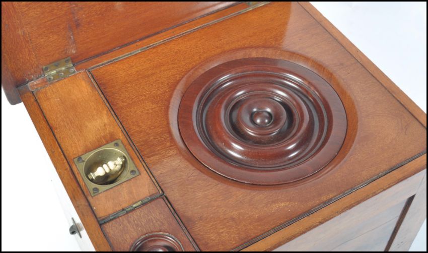 A 19th century Victorian mahogany campaign box commode  having a hinged top opening to reveal a ceramic liner with brass flush and hinged side locker.  Measures 48cms high x 61cms wide x 53cms depth