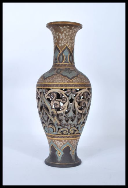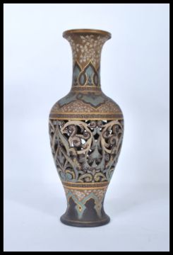 A 19th century Doulton Lambeth stoneware fret pierced vase of baluster form. Lattice pierced centre with stamps to base for ' Doulton Lambeth Silicon 1883 ' along with initials. Measures 33cms high approx