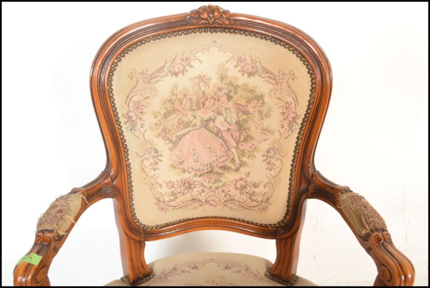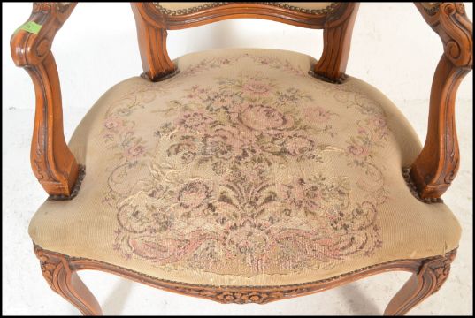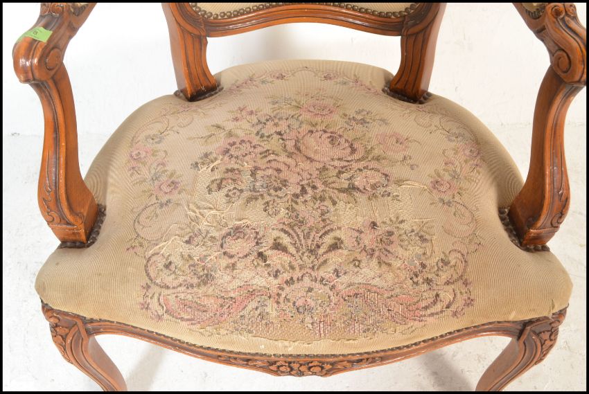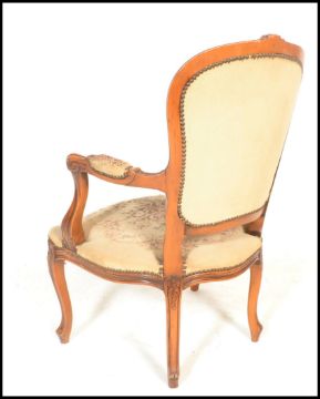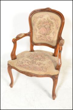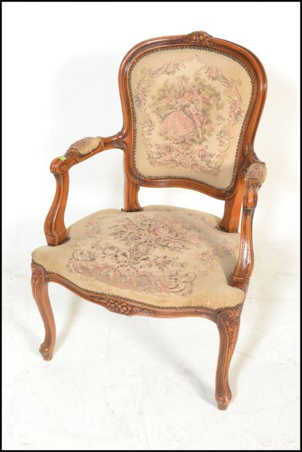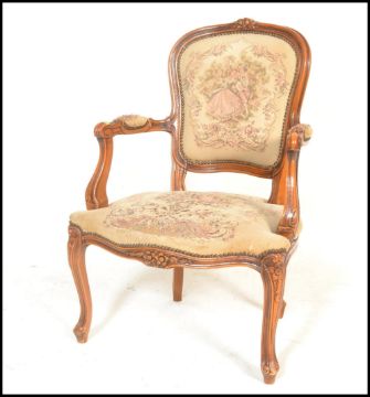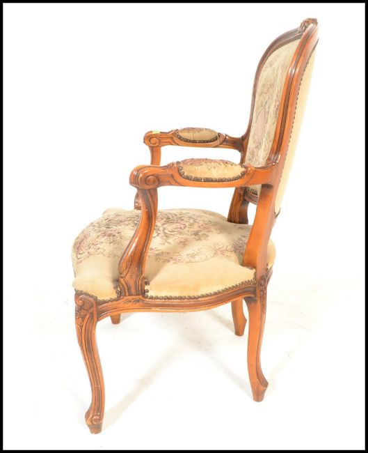 A 20th Century French carved fruitwood fauteuil or open arm elbow chair, the seat and back upholstered with tapestry and standing on cabriole supports. Measures 93cm high x 65cm wide x 56cm depth.