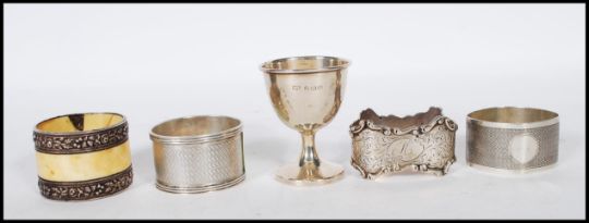 A collection of four silver hallmarked non matching napkin rings together with a silver hallmarked pedestal egg cup. Weight 127g.