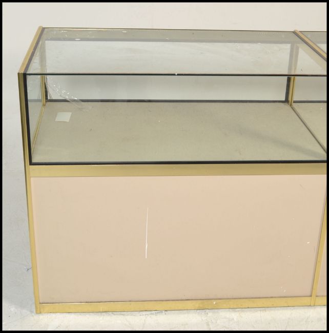 A 20th century large shop  / haberdashery display cabinet. The rectangular body with glass display top having cupboards to the base at the rear. Finished with gilt banded metal edges