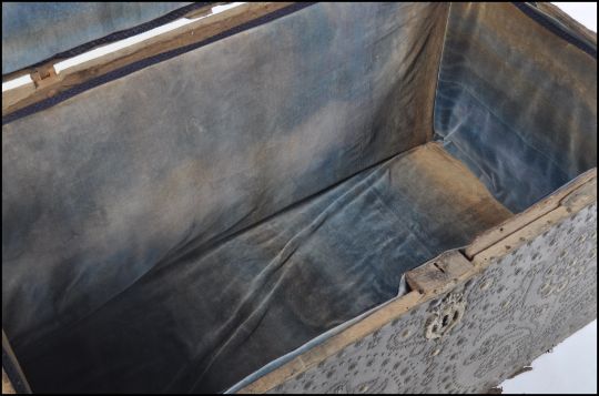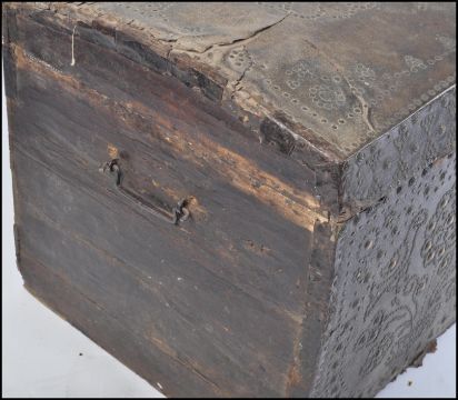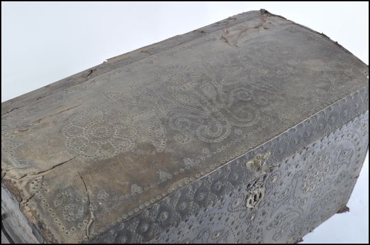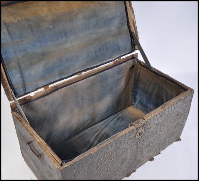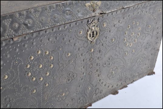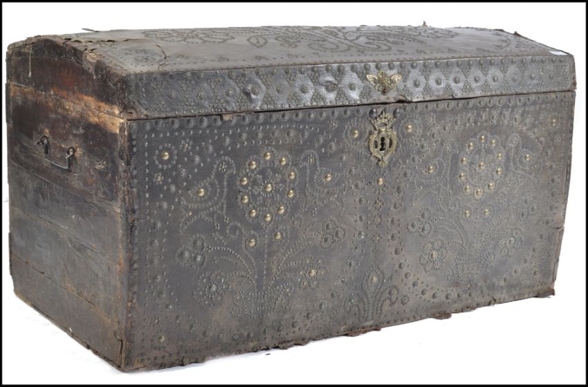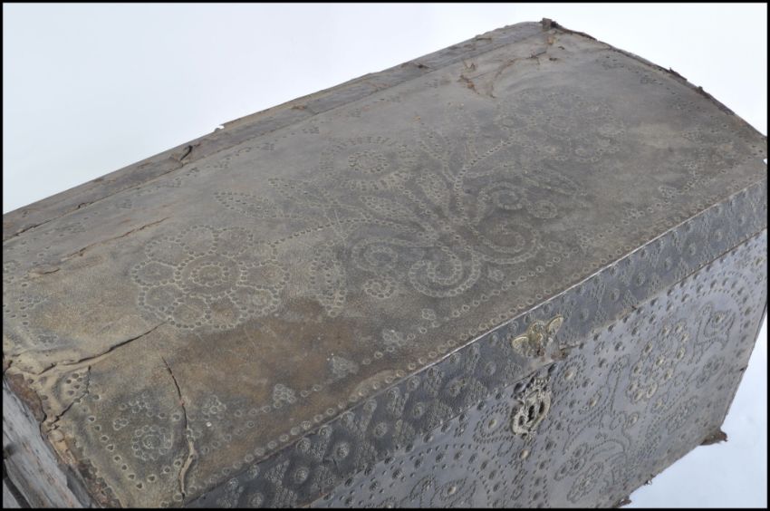 Believed early 18th century Queen Anne leather and stud work pine dome top travel trunk. The  large dome top trunk with leather and stud worked outer, hinged top enclosing appointed lined interior within. The trunk having been used on the set of BBC1's Poldark period drama series. Measures 58cms high x 110 cms wide x 58cms depth