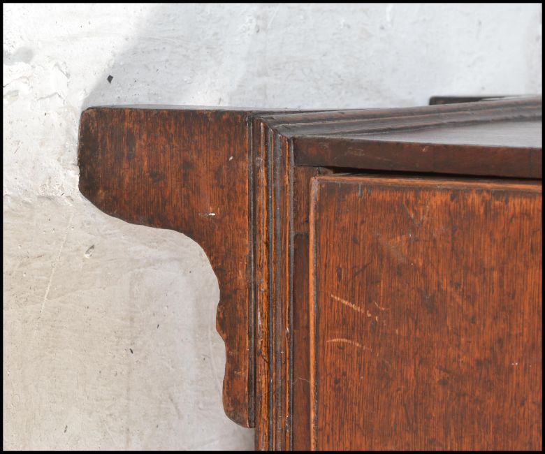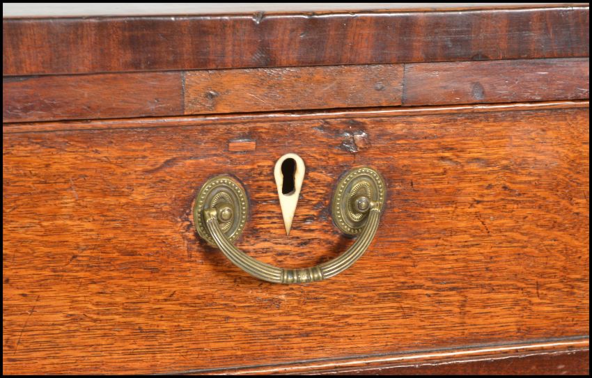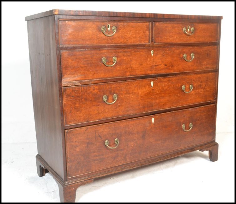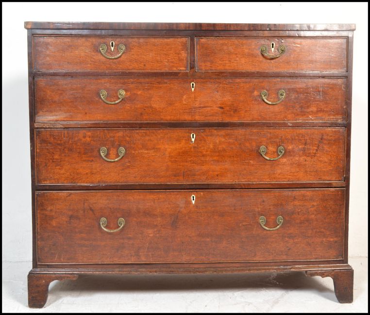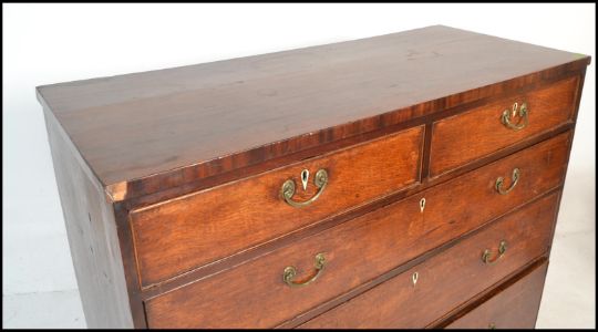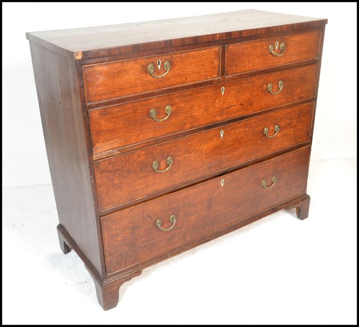 A good 18th / early 19th century large North Country cross banded chest of drawers . Raised on  bracket legs the upright, wide chest with a configuration of 2 short over 3 deep drawers all with brass swing handles.  Pine lined drawers with hand dovetail construction. Measures 113cm high x 129cm wide x 55cm depth.