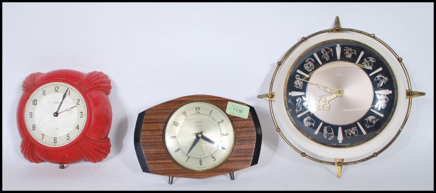A group of three 20th Century retro clocks by Metamec, two being wall clocks with one having zodiac characters, the other being a mantel clock.