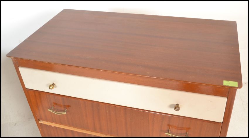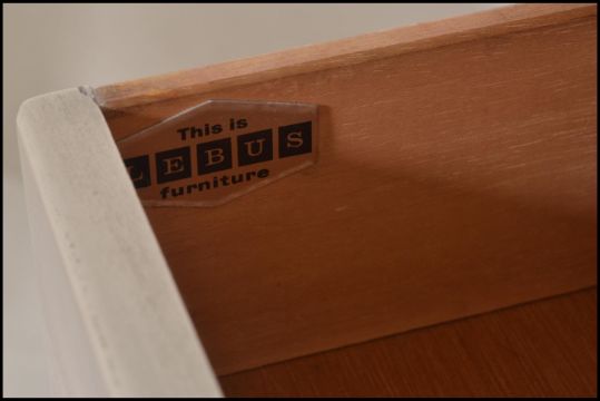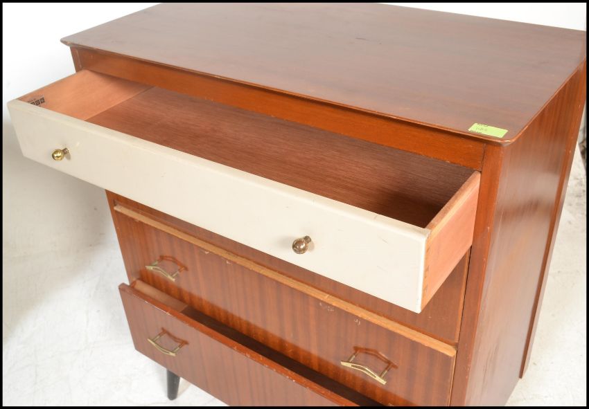 A vintage mid 20th Century teak wood dressing table with a matching chest of drawers, both pieces raised on ebonised supports. Measures 43cms H x 98cms W x 45cms D.
