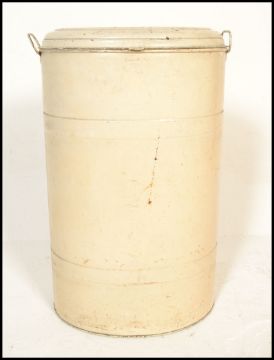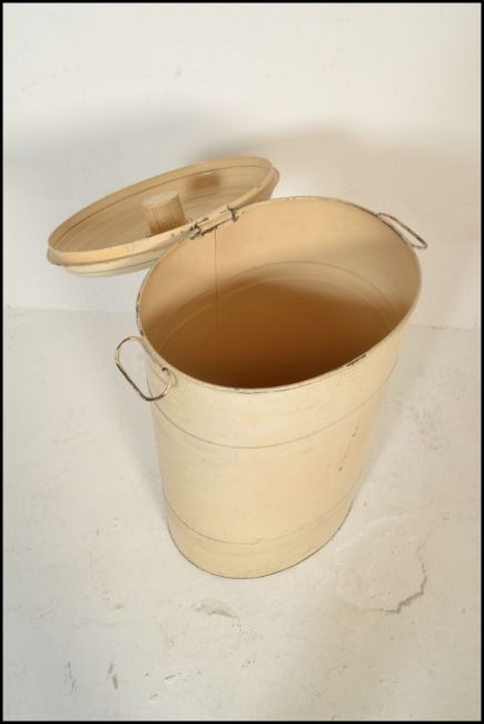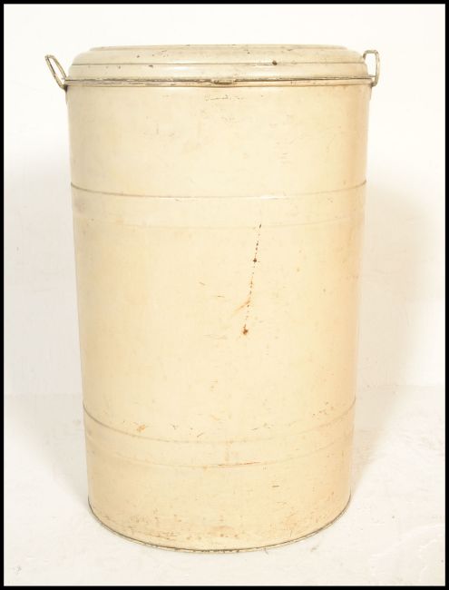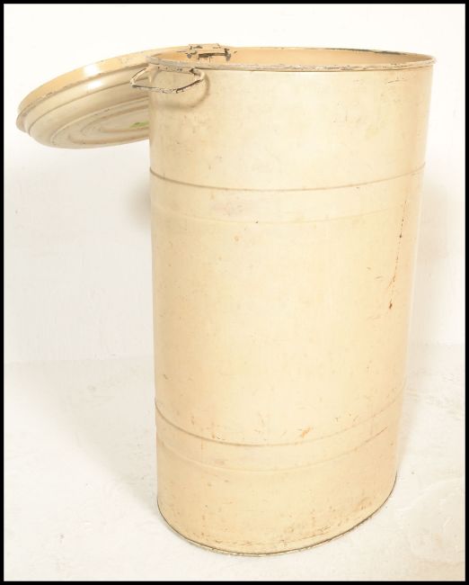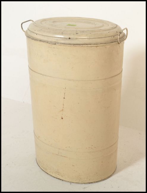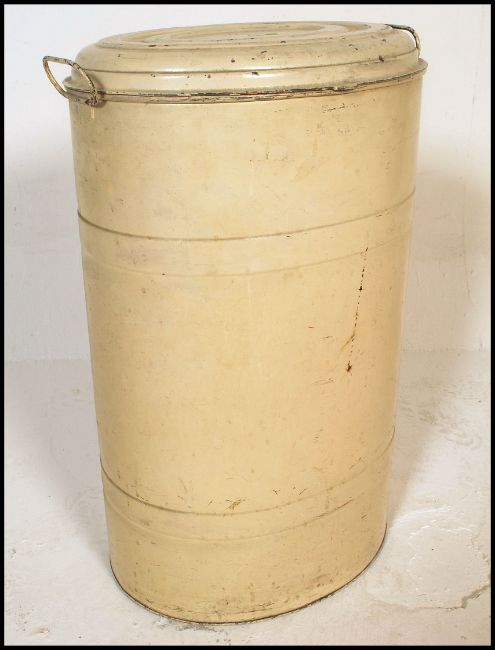 A vintage mid 20th Century industrial metal flour bin, hinged lid to the oval flour bin body. Measures 72cms x 52cms x 35cms.