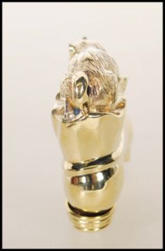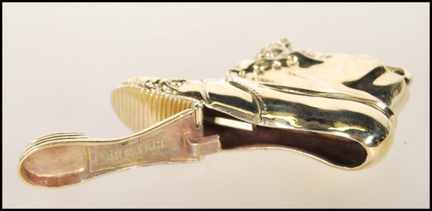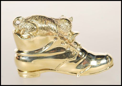 An 18ct gold plated vesta in the form of a shoe with cat atop. The heel of the boot opening on hinge, stamped 18ct gold plated. Total weight 49g / Length 6.5cms long