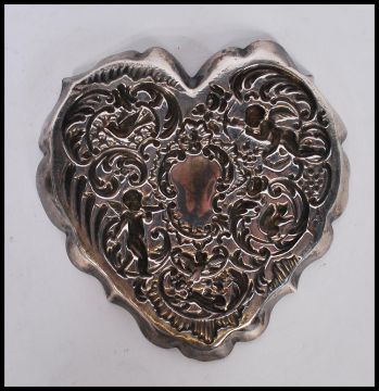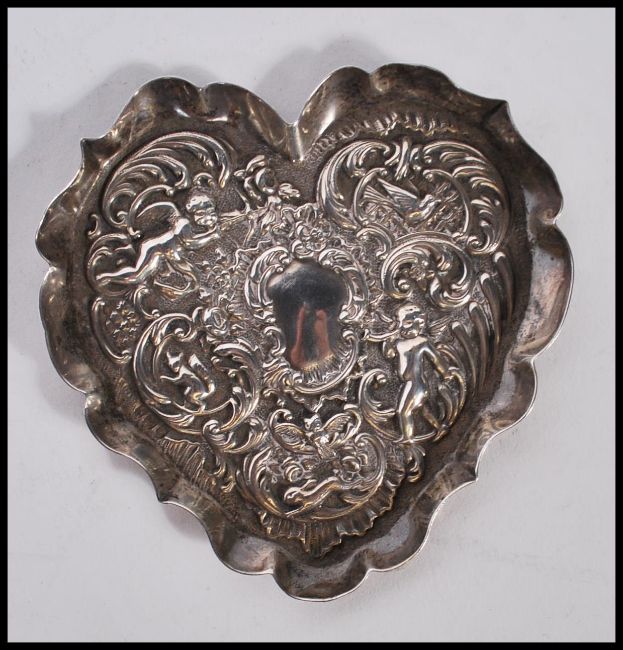 A silver hallmarked rococo heart shaped pin dish, the heart shaped dish decorated in relief with cherubs, owl, squirrel, central cartouche, London assay, dating to 1925. Weighs 44g