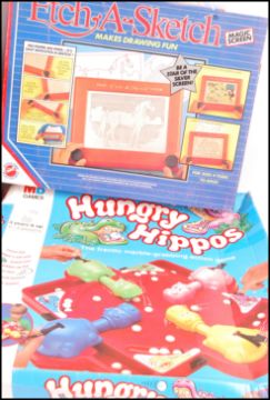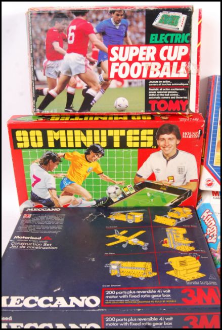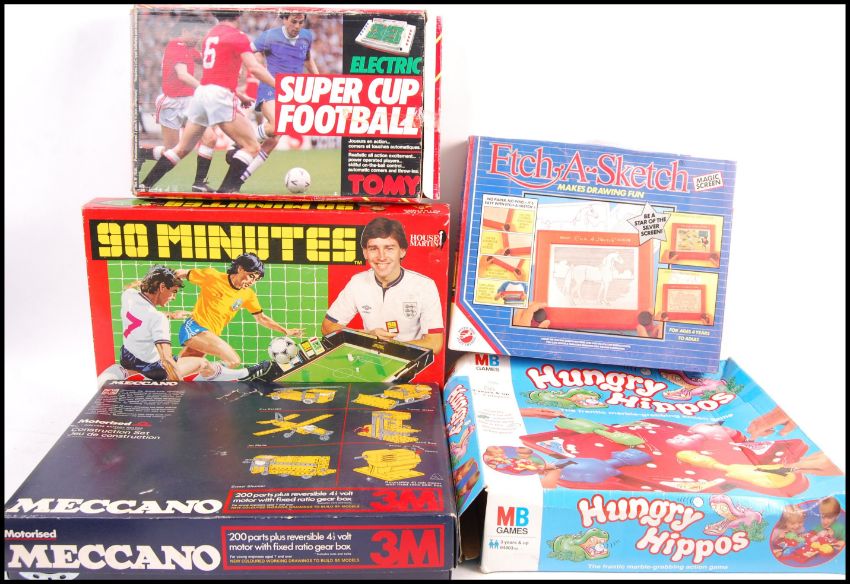 A collection of vintage board games comprising: Meccano 3M motorised set, 90 Minutes Football game, Super Cup Football, Peter Pan Playthings Etch A Sketch and a MB Games Hungry Hippos.