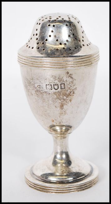 Two pairs of silver hallmarked pepperette and table salts condiments, the pepperettes on round stepped bases with pierced matching lids and the salts being raised on cab legs with gilt interiors. Hallmarked London 1906. Total weight 185.1g.