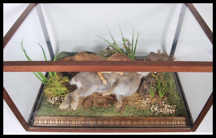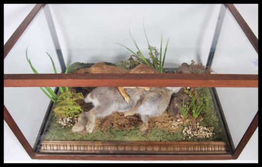 An early 20th century cased taxidermy study of a weasel killing a rabbit being set to a naturalistic plinth base and housed in a glass case with wooden frame, the top lifting off the base.