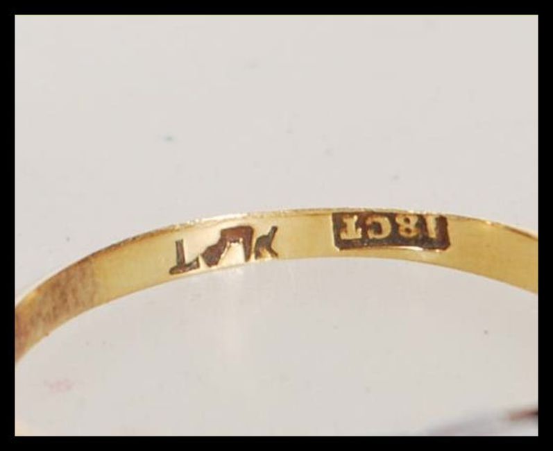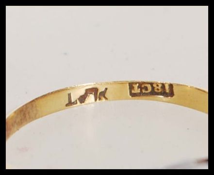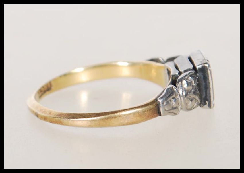 An Art Deco 18ct gold, platinum and diamond ring having a square head with  illusion set round cut diamond having pierced and steel cut foliate shoulders. Weight 2.0g. Size J.