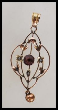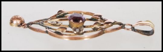 A 19th Century Victorian marked 9ct gold open work pendant set with seed pearls and a central Amethyst stone with floral decoration. Stamped 9ct to verso. Weighs 1.8g