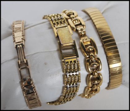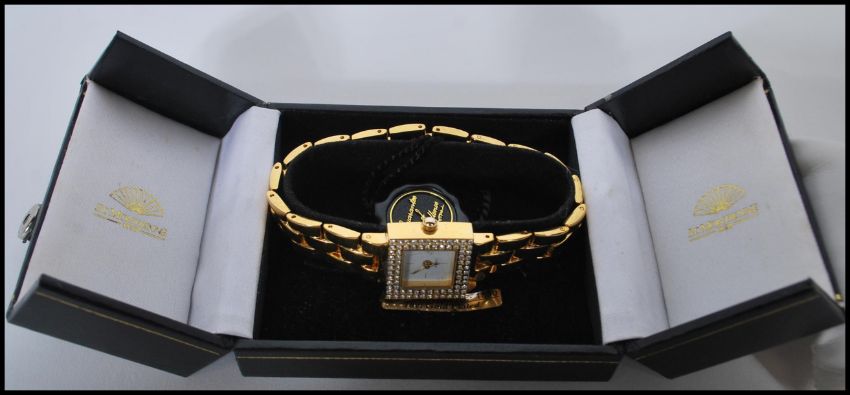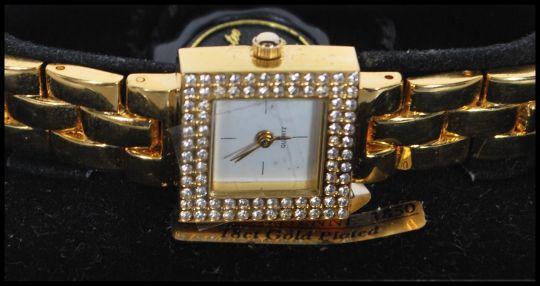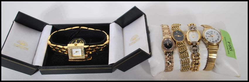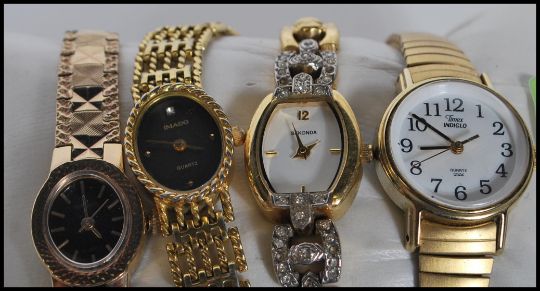 A collection of vintage ladies cocktail watches to include a Timex Indiglo having a white enamelled face on a bracelet strap, a Sekonda wrist watch having a gold tone strap set with white stones, an Imado watch having a brown oval face, a Sekonda watch having a brown oval face on a gold tone strap and a St Montienne gold plated wrist watch set with white stones.