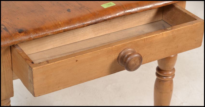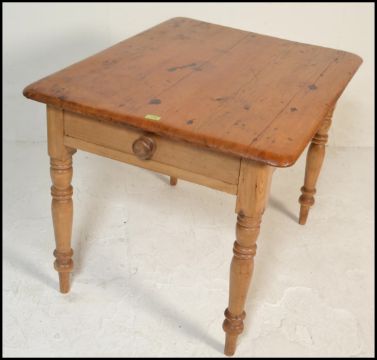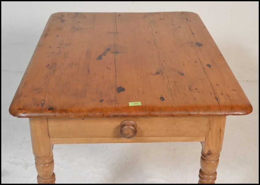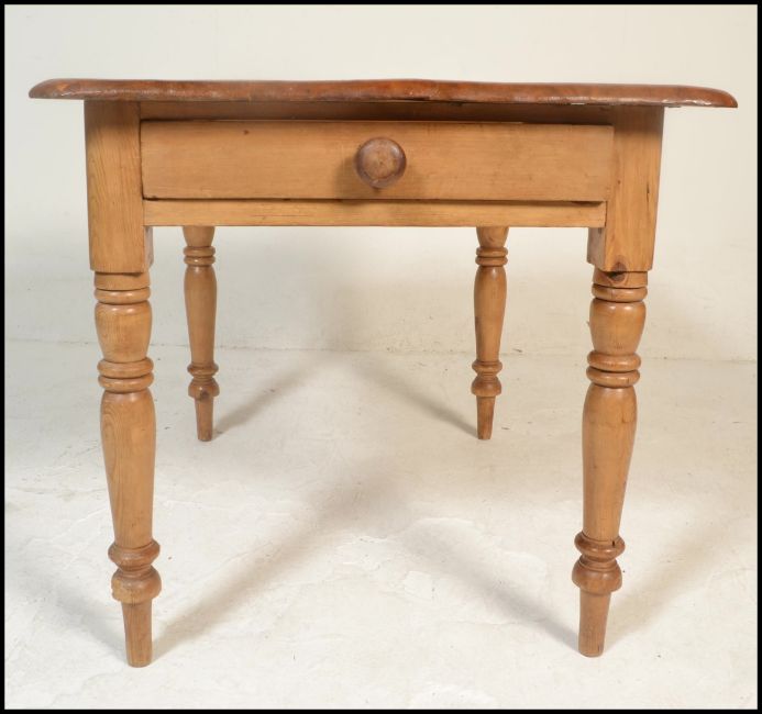 A Victorian 19th century country pine dining table being raised on turned legs with fitted frieze having a planked table top with chamfered edge detailing. Dimensions are 76cms H x 102cms W x 78cms D.