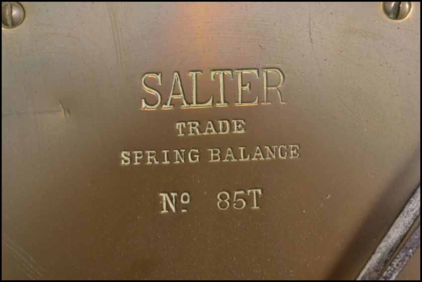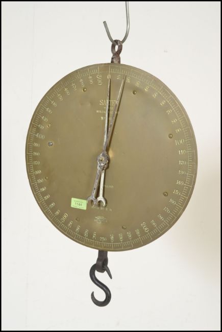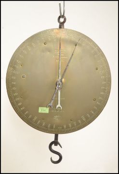 A Victorian brass and iron Salter`s Trade spring balance scale, circular brass register with iron hooks above and below, to weigh up to 500lbs. Together with three other spring balance scales. 41cms in diameter.