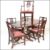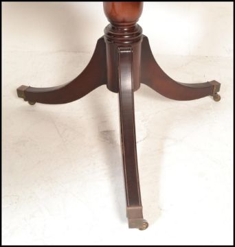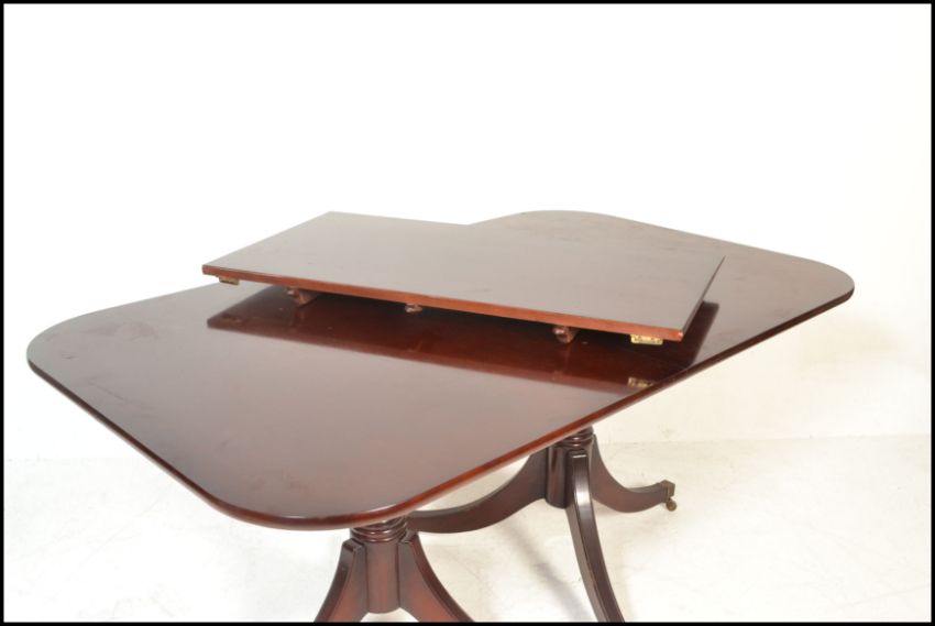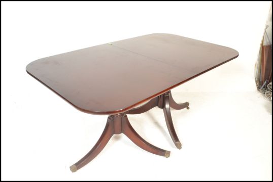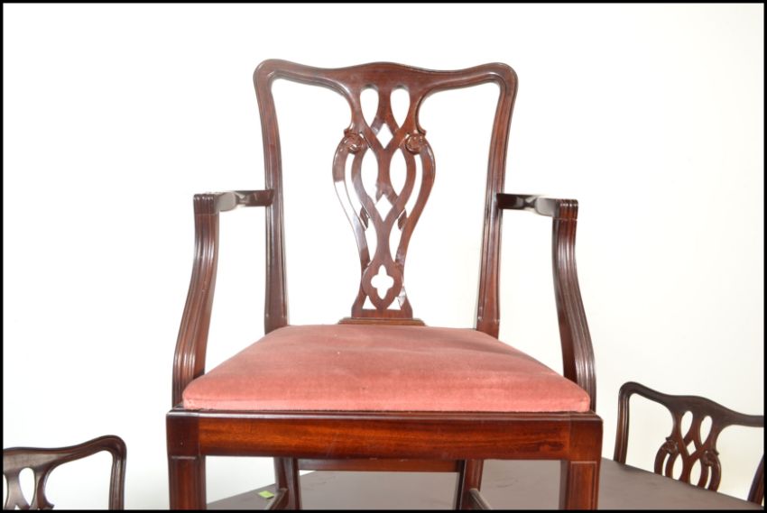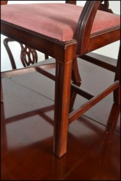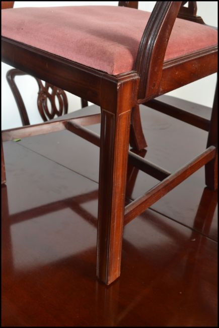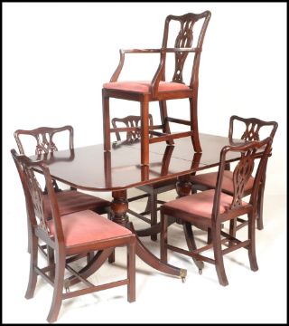 A large Regency revival  mahogany pedestal dining table together with a matching set of 6  hepplewhite chairs raised on squared legs united by stretchers, drop in seats with pierced back rests. Measures 80cms x 163cms 100cms.