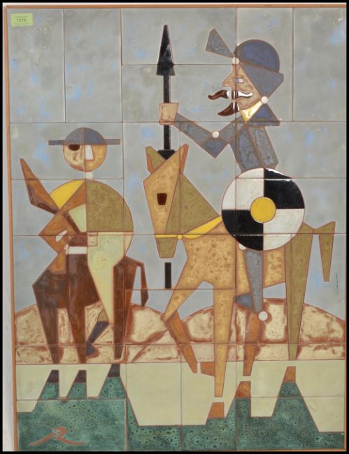 A vintage retro 20th Century tiled wall art panel depicting Don Quixote and Sanchez riding on donkeys, signed R to the corner, within a vintage wooden frame. Measures 82cm x 62cm.