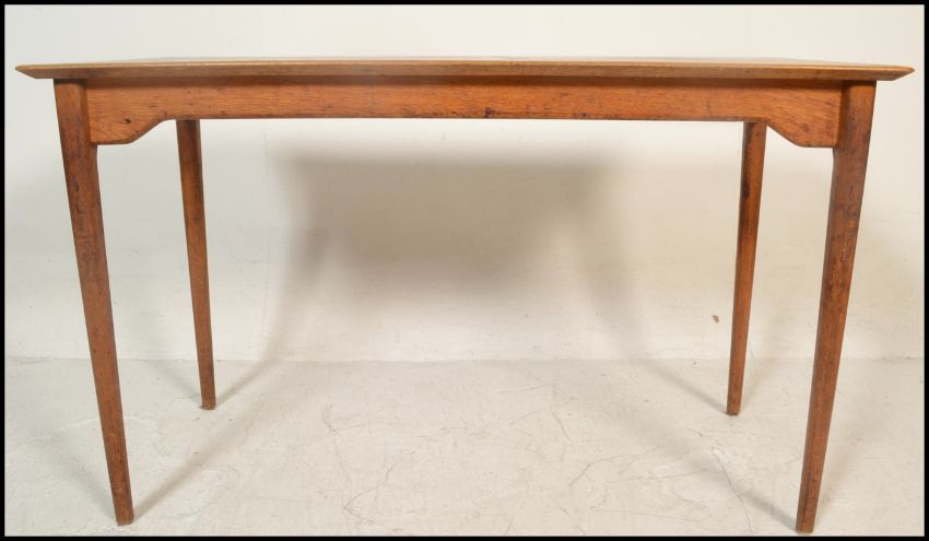 A good mid century oak dining table, possible Air Ministry origin. Raised on turned legs with a fitted frieze frame having stunning chamfered edge oak rectangular table top above. Measures 71H x 121H X 62 D.