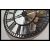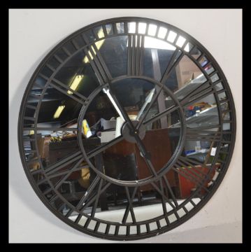 A large contemporary ebonised iron framed skeleton wall clock, mirrored backed and iron roman numeral chapter ring fitted with large ebonised hands.