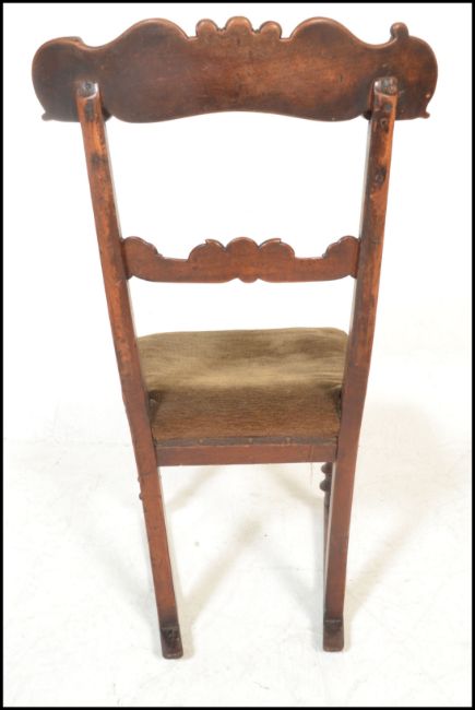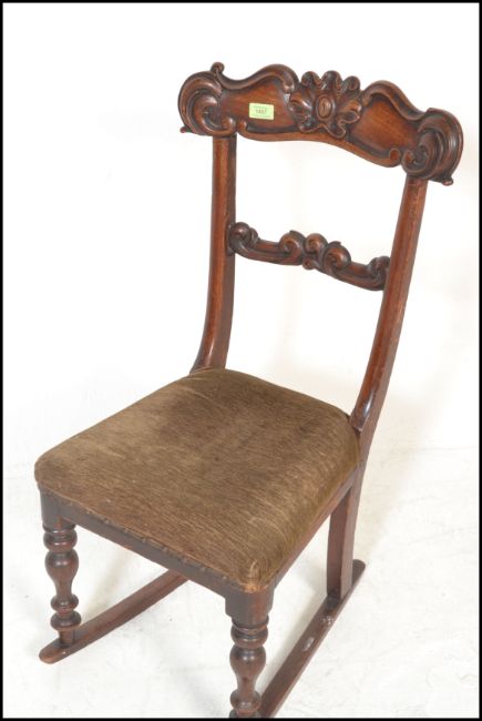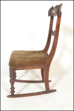 An 18th Century Georgian Regency mahogany bar back rocking chair, carved backrest raised on turned supports terminating on sleigh rockers. Measures 85cm high x 37cm wide x 48cm depth.