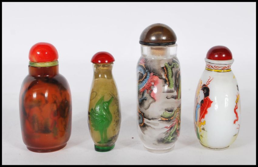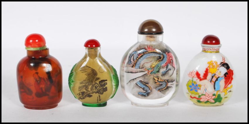 A group of four 20th Century Chinese snuff bottles to include three reverse painted bottles in the largest decorated with a Chinese dragon, a green glass eagle bottle, an amber bottle with figurative scenes and an enamelled bottle depicting a child holding a fish.