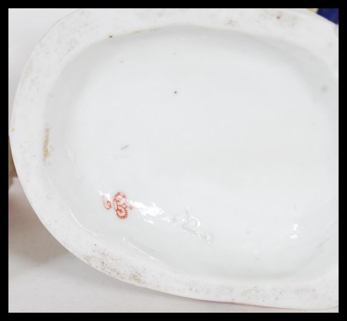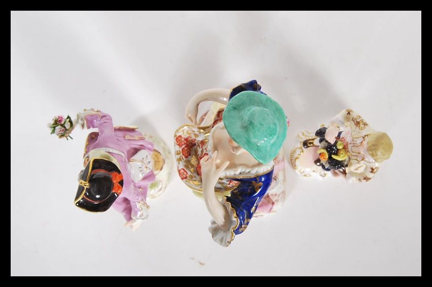 A Group of porcelain figurines to include a Crown Derby figurine depicting a Georgian lady with hand painted gilt detailing, stamped with a c.1775 Crown Derby mark to the base, a later 20th Century Crown Derby figure 'The Fruit Seller' by Edward Drew and a 19th Century Meissen figure of a Georgian courting gentleman holding a bouquet of flowers. AF.Measures 21cm high.