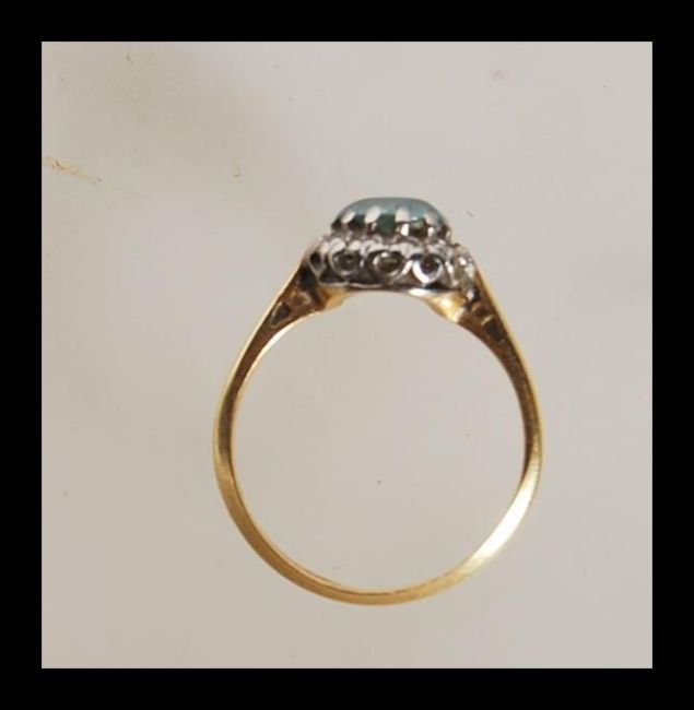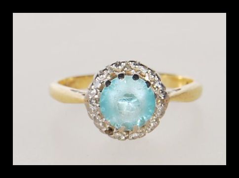 A 18ct gold dressing having a prong and white metal illusion set, with round cut blue stone to centre, on a stamped 18ct band. Gross weight 2g. Size H/I.