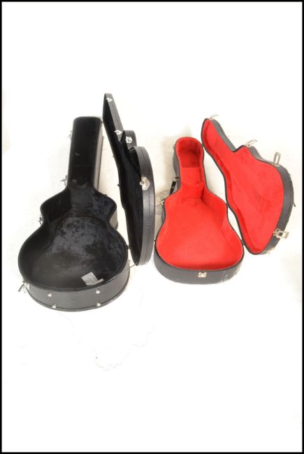 Two black faux leather guitar cases one having red velvet interior and lock catches, together with another made by Stagg having black soft interior, Stagg label to side.