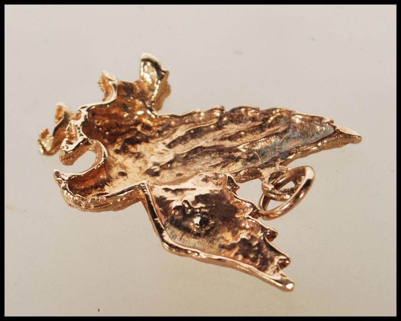 A 9ct gold pendant in the form of an eagle with engraved decoration. Unmarked but tests as 9ct gold. Measures 2.8cm. Weight 2.6g.