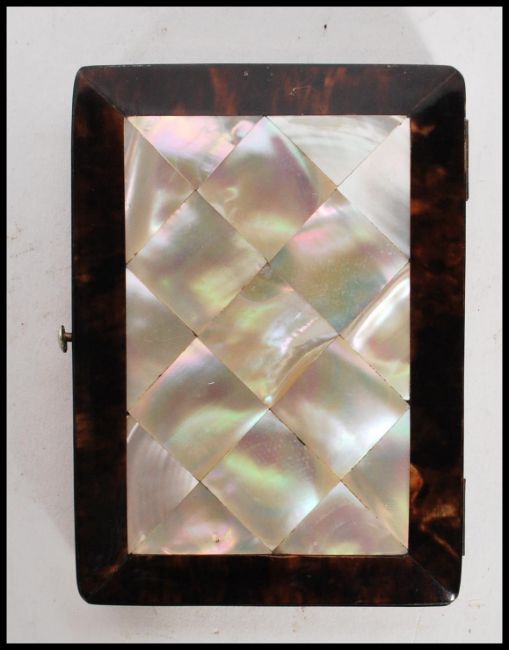 A late 19th Century / early 20th Century calling card case having a central mother of pearl panel with a tortoise shell borders, having a central diamond shaped silver panel engraved with geometric decoration and initials A W, opening to reveal a fanned compartmentalised interior.