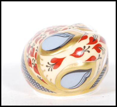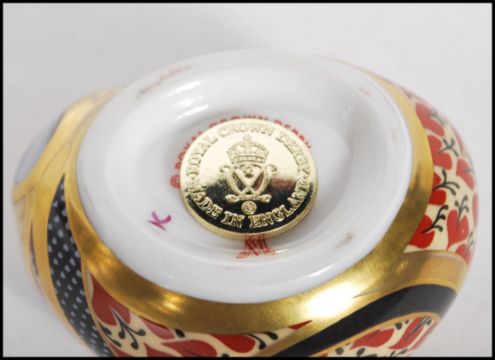 A crown Derby paperweight in the form of a mouse in a curled position with red and yellow floral patterning and gilt detailing. Gold stopper to base.