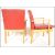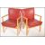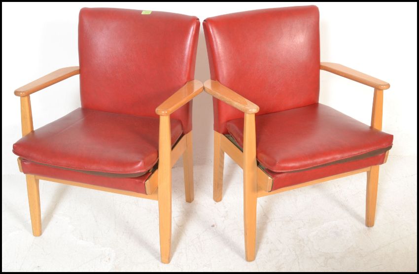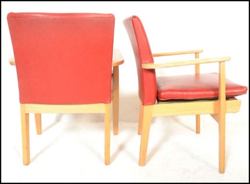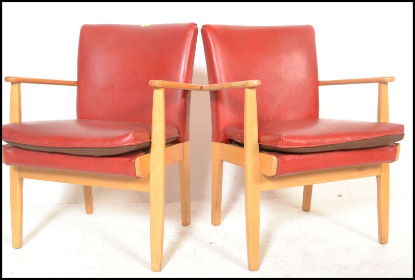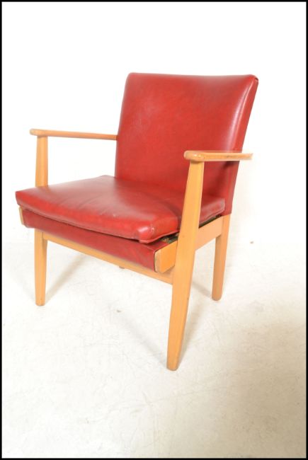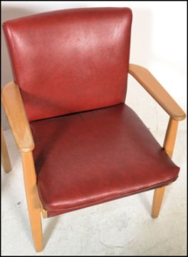 A set of four vintage retro Parker Knoll model 733 open framed armchairs, sweeping arms, seat pads and backrests upholstered in red faux leather raised on shaped tapering supports.