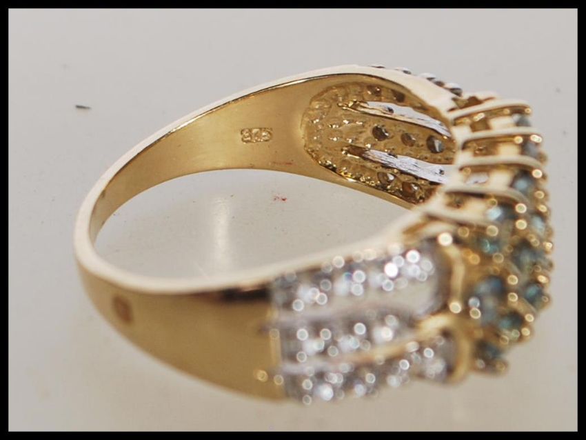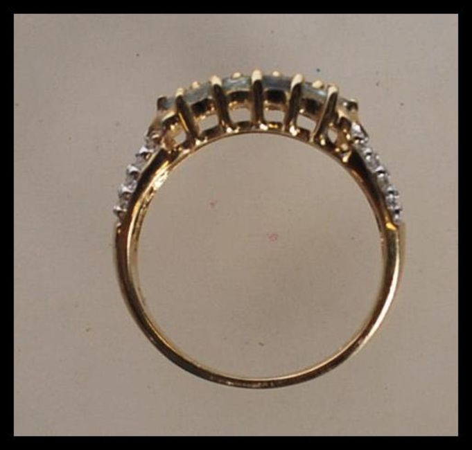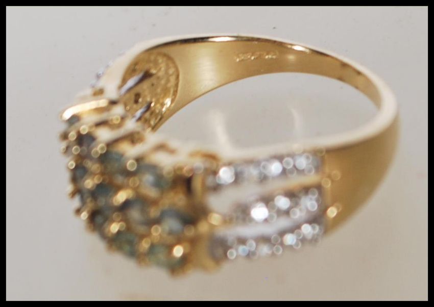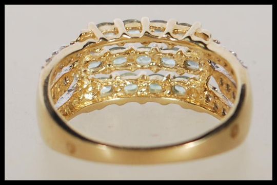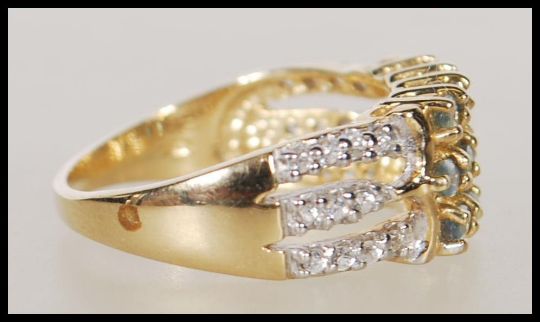A hallmarked 9ct gold dress ring having three bands set with white and green accent stones. Hallmarked Birmingham. Weight 3.8g. Size N.5.
