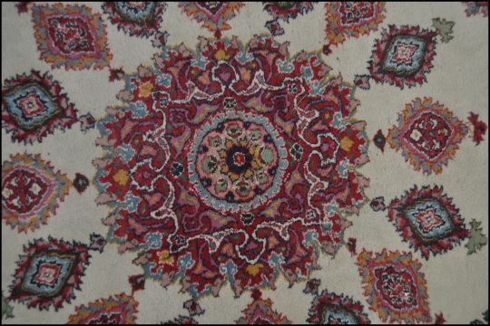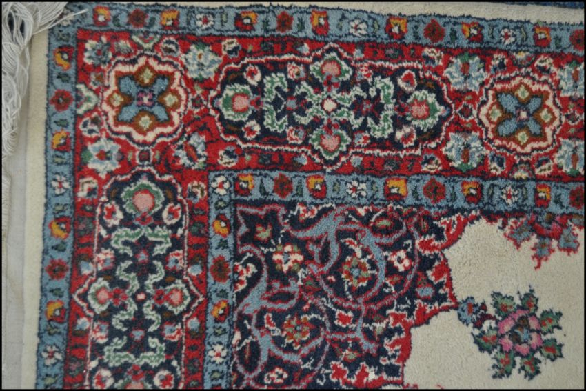 An early 20th Century Persian carpet rug having a white ground with geometric panels and medallions with tassel ends. Measures 180cm by 123cm.