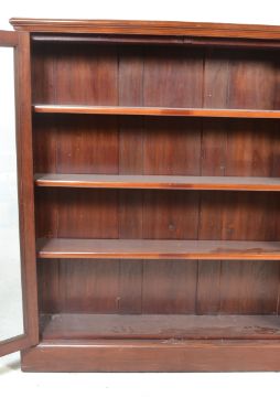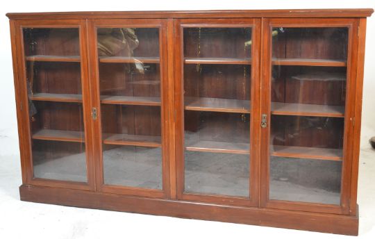 A 19th century Scottish Victorian large solid mahogany double open window library / lawyers bookcase cabinet by Charles Jenner & Co Edinburgh. Raised on a plinth base with twin sections having adjustable shelves behind 4 glass doors. Flared top above. Measures 131cms high x 229cms long x 31cms depth. Shelves 108cms wide x 20cms depth x variable heights