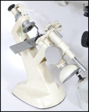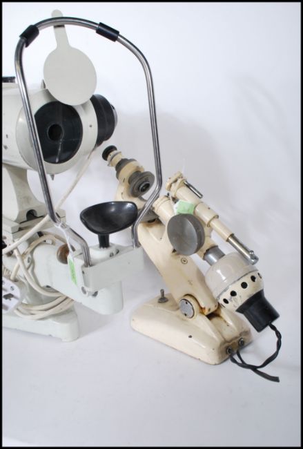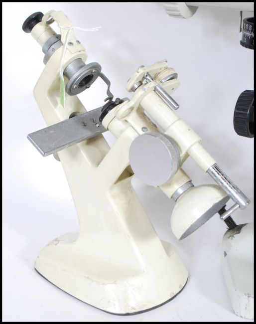 A group of three vintage 20th Century scientific optical instrument to include a Spanish Bobes Keratometer having adjustable knobs to sides. A Microscope by Tokyo Kogaku Kikai K.K. No 3647. Original enamel finish, together with another Microscope by Eyco made in Japan for East Yorkshire Optical Company. Original enamel finish with switch to base.