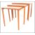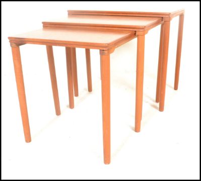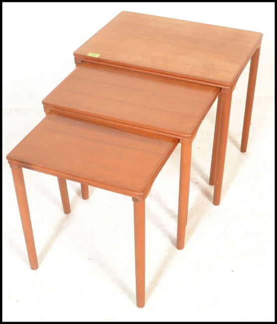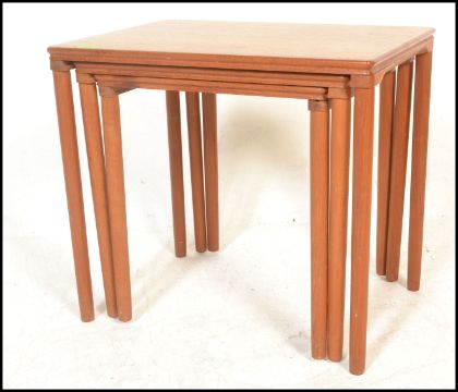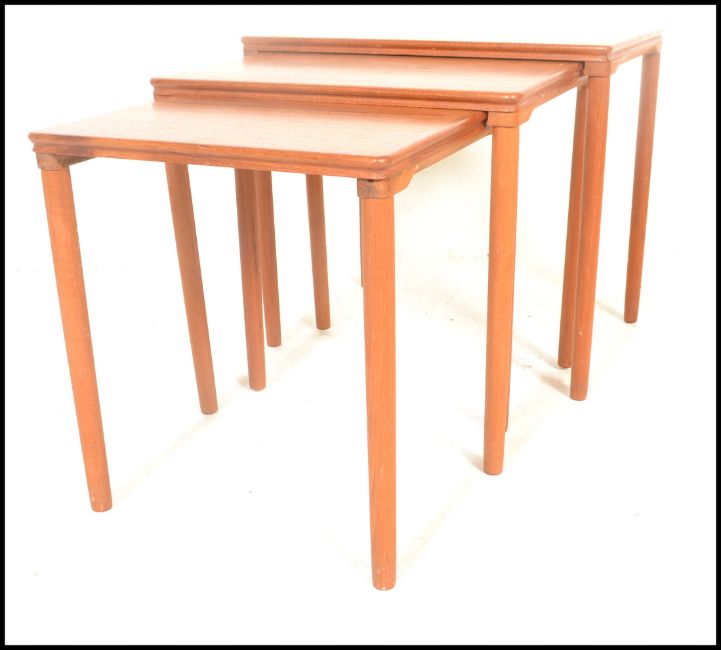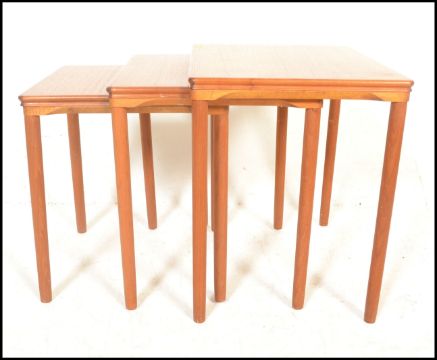 A retro 20th Century Danish teak wood nest of three graduating occasional tables raised on shaped tapering supports. Measures 56H x 55W x 39D.