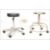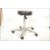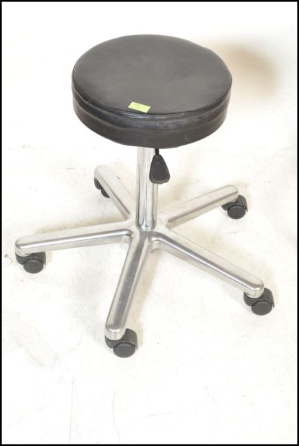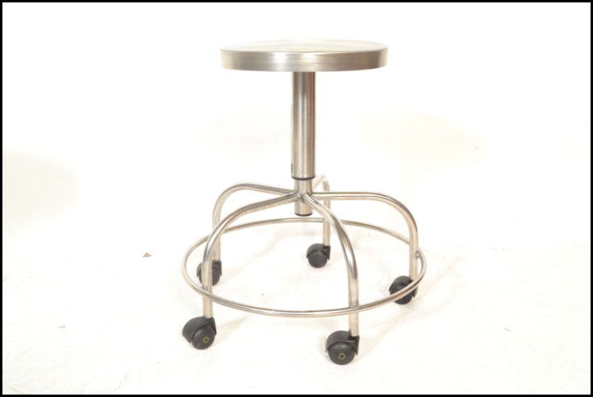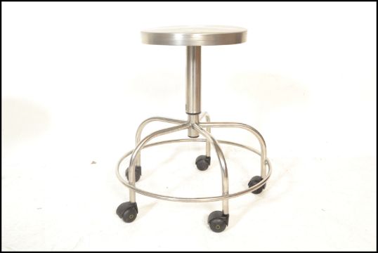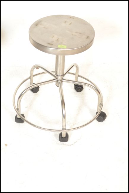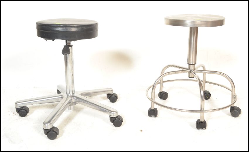 Two retro 20th Century industrial medical / dentists stools, both stools fitted with circular seat pads raised on chrome tubular frames terminating on castors. 56cms x 33cms.